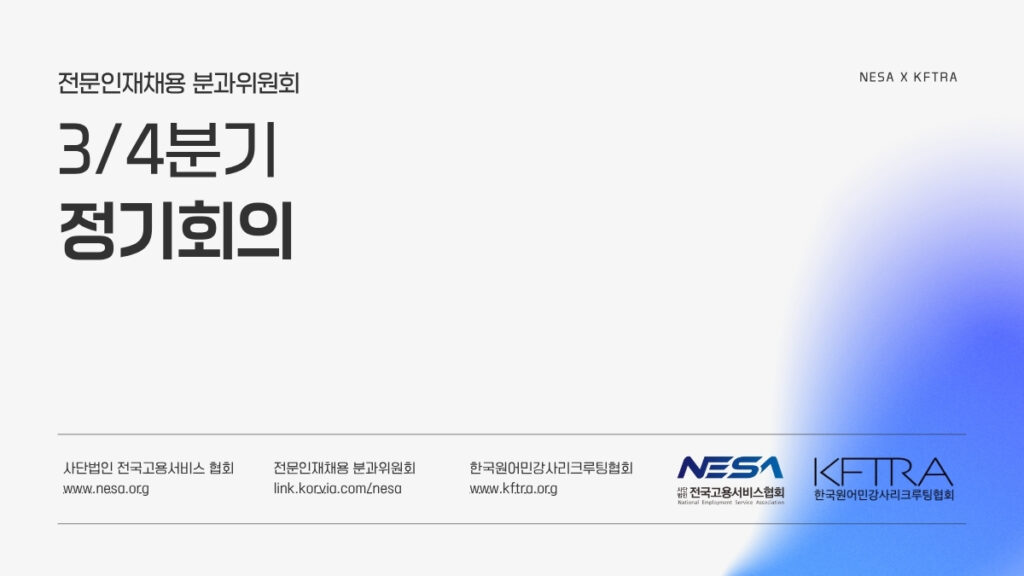 사단법인 전국고용서비스협회(NESA)와 한국원어민강사리크루팅협회(KFTRA)가 공동으로 진행한 전문인재채용 분과위원회 3·4분기 정기회의 공식 자료를 바탕으로 재구성한 것입니다. 실제 회의에서는 ▲표준계약서 준수, ▲채용서비스 범위 명확화, ▲숙소 제공 시 고용주 책임, ▲부당해고 예방, ▲업계 표준화 방향 등이 심도 있게 논의되었으며, 본 글은 그 핵심 사항 중 ‘원어민 강사 주거 지원 방식’과 ‘리크루팅 서비스의 역할 및 한계’를 이해하기 쉽게 정리한 해설입니다.