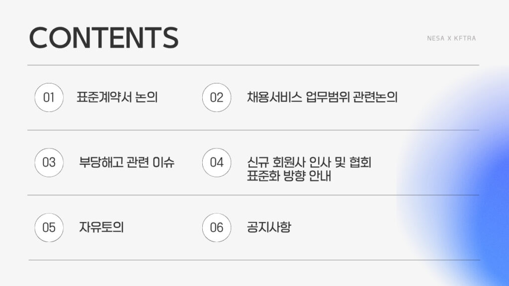 KFTRA는 NESA 전문인재채용 분과위원회와 함께 원어민 강사 채용 시장의 투명성과 공정성을 높이기 위한 기준 마련에 지속적으로 참여하고 있으며, 학원·학교·리크루팅 회사·지원자 모두가 안정적인 채용 환경 안에서 신뢰롭게 협력할 수 있는 구조를 만드는 데 주력하고 있습니다.